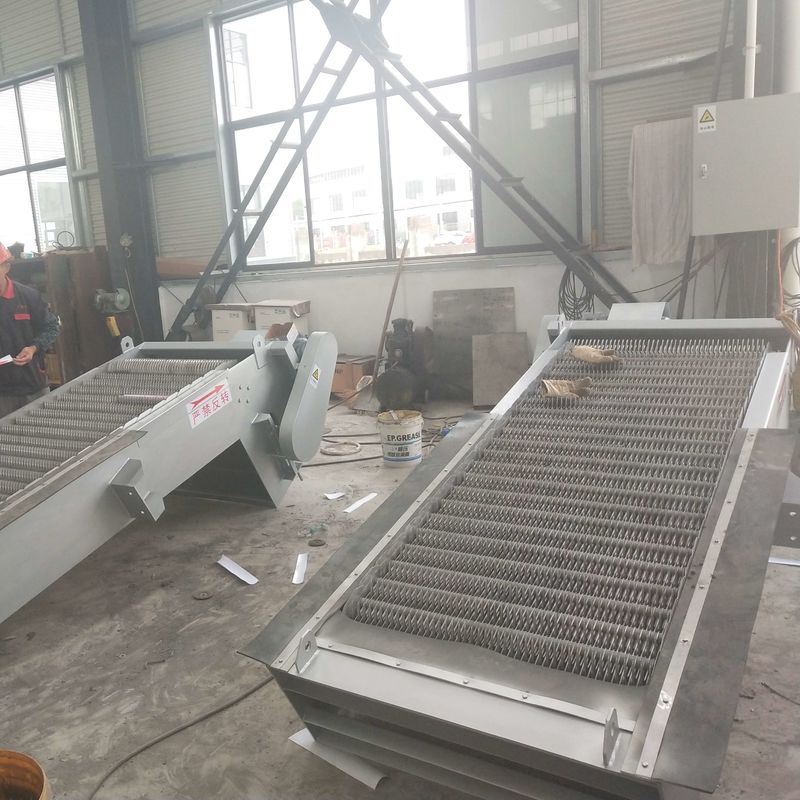 A água de esgoto incorpora o meio de um lado da máquina de limpeza da barra fina vertical do orifício, e é descarregada do interior e da parte externa com as grades de abertura em ambos os lados. A escória interceptou no interior é levantada à área superior da descarga da escória com a rotação da grade de abertura. A escória da grade é lavada pelo sistema de lavagem no tanque de coleta interno da escória, e enviada então ao equipamento seguinte através do equipamento de transtorte, e a tela está limpa igualmente lavado e incorpora o ciclo de trabalho seguinte.