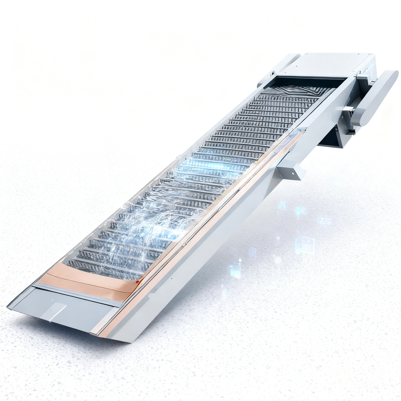 Quando a corrente do dente é transportada à parte superior e à parte traseira do equipamento, devido ao papel de guiamento da roda de corrente e do trilho curvado, as fileiras paralelas do dente podem ser deslocadas, de modo que a sujeira contínua possa cair no sulco da escória por seu próprio peso. Quando cai limpamente, este tipo da grade é fácil trazer a sujeira no canal atrás da grade.